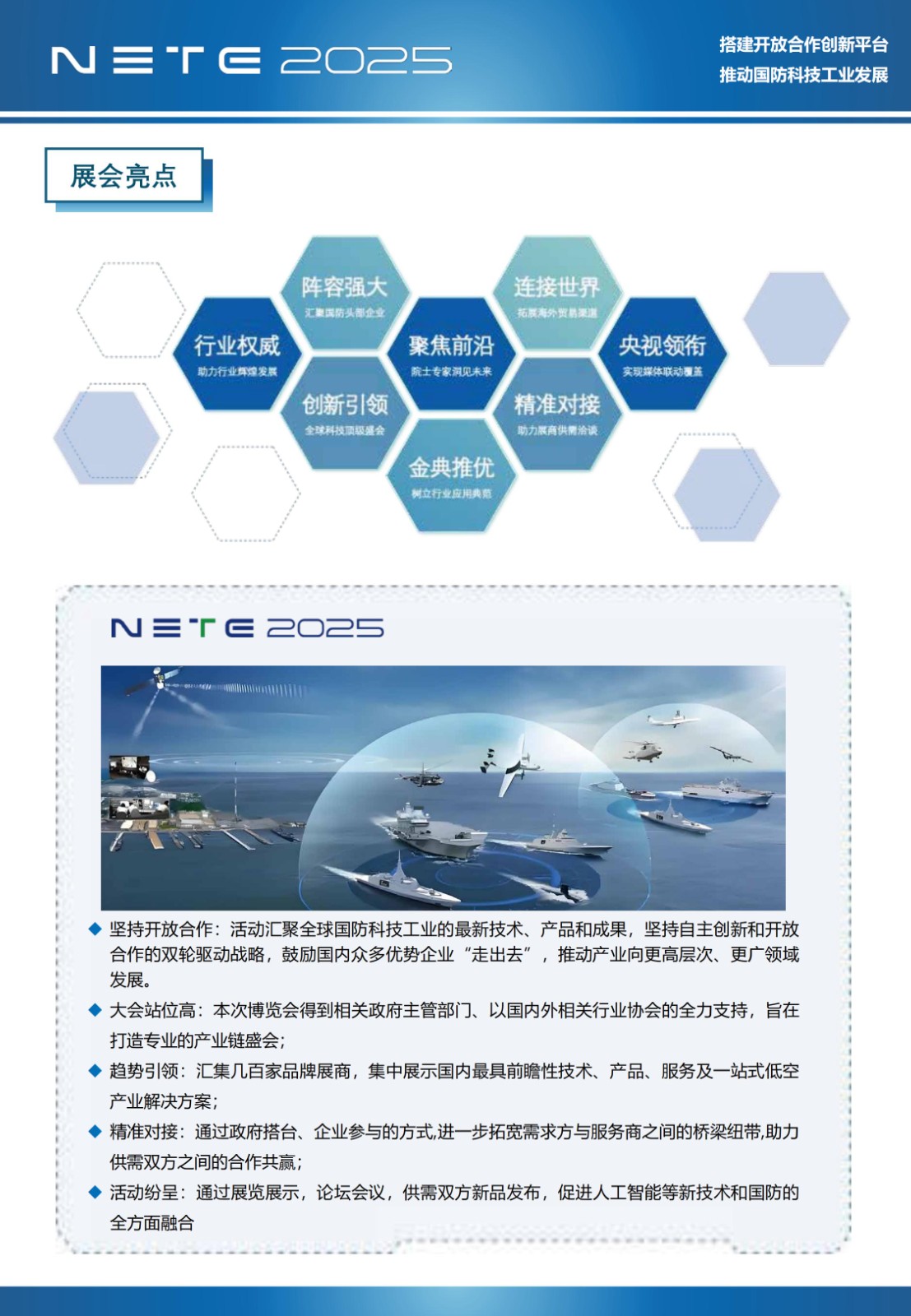 本届博览会规划三万平米,将邀请政府、协会、科研机构以及企业等广泛参与,汇聚了全球国防科技产业的最新技术、产品和成果,为行业内的企业和专家提供一个交流、合作和学习的平台,进一步学习国内外先进技术及经验,推动产学研用深度融合,促进项目快速落地发展,为产业的可持续发展提供有力支撑。旨在打造国际品牌盛会,搭起行业的新架构和新引擎。
